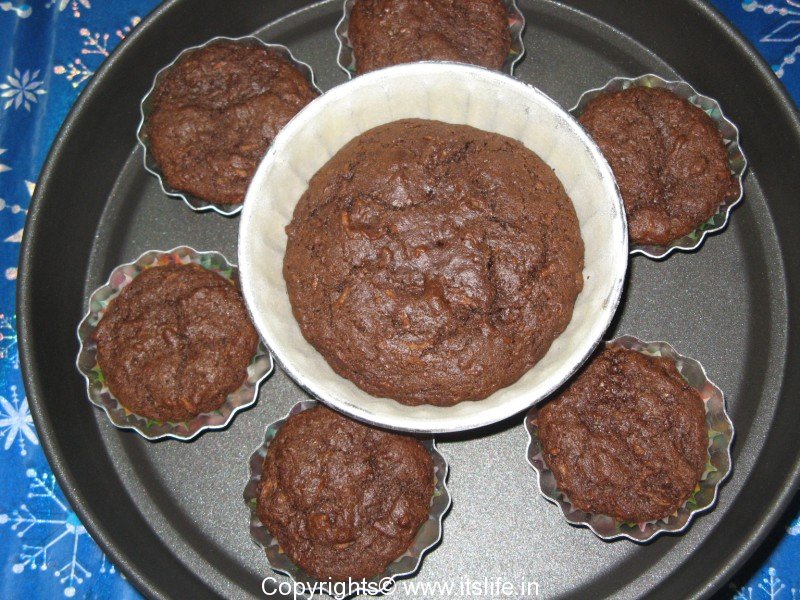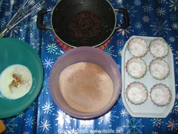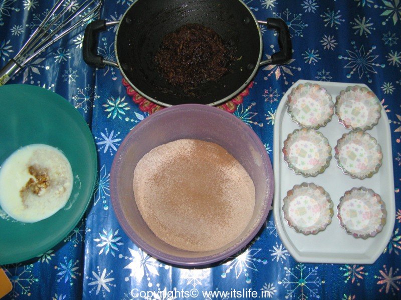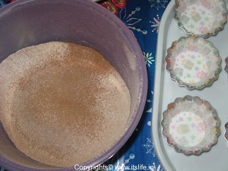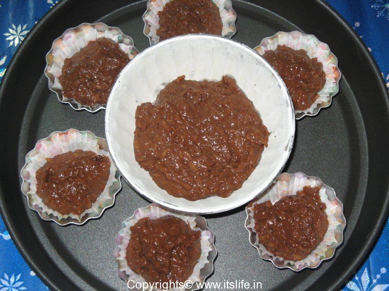 Pre-heat the oven at 180 degrees. Line the muffin cups with paper cups.