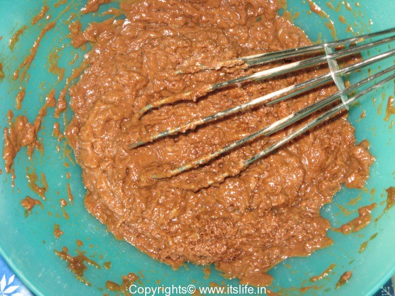 Add Wheat flour mixture (sieved) to the milk-curd mixture little by little and mix gently.