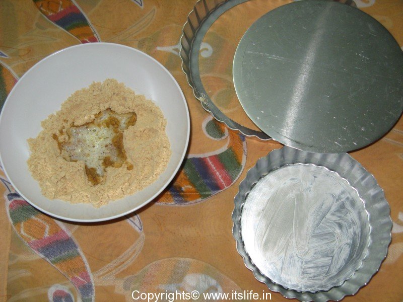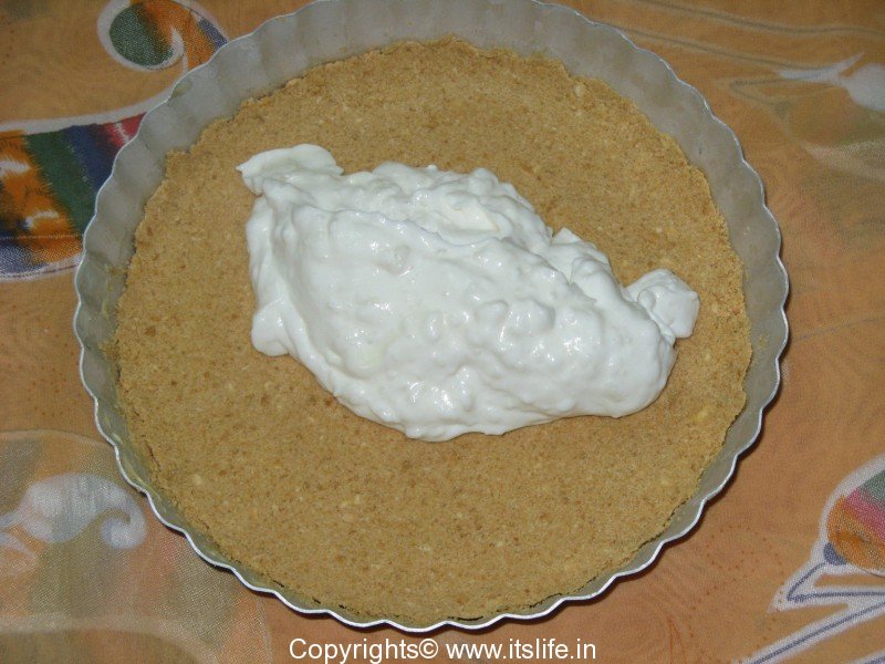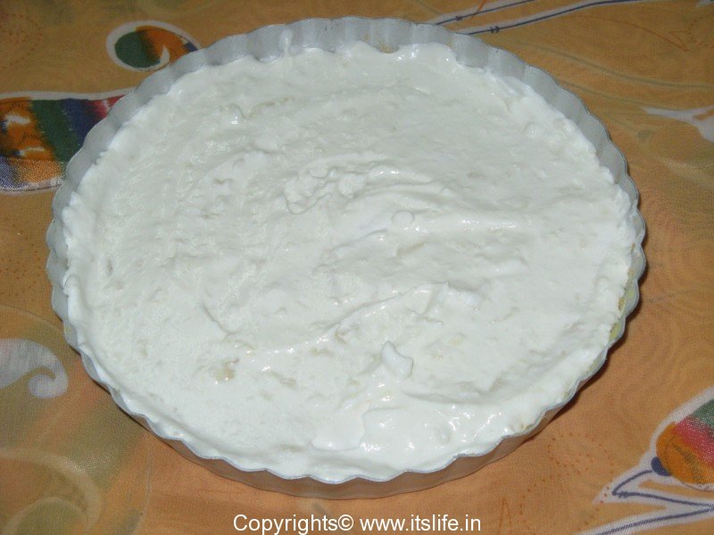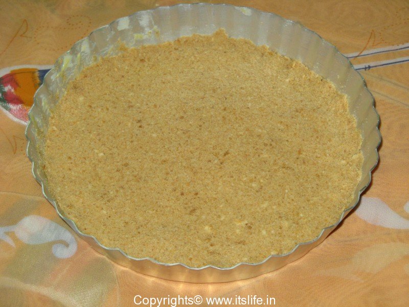 Press this mixture at the base of the tin and keep in freezer for 10 minutes. Cake instead of Biscuit powder can be used to line the tin.