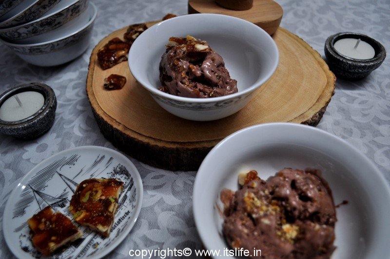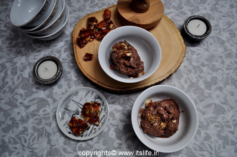 Choconut Ice cream is chocolate ice cream with dry fruit praline. The crunchy praline inside chocolate flavored ice cream is an indulgence enjoyed during summer time.
