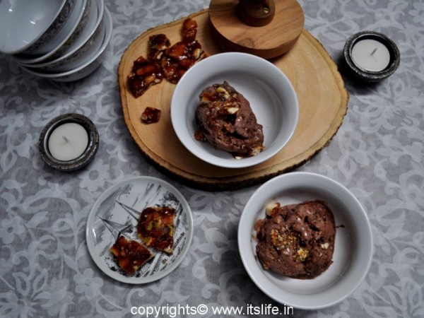 Choconut Ice cream is chocolate ice cream with dry fruit praline.  The crunchy praline inside chocolate flavored ice cream is an indulgence enjoyed during summer time.