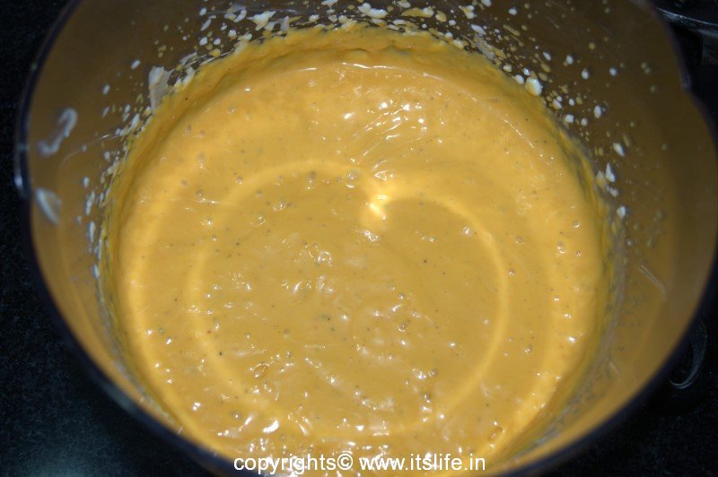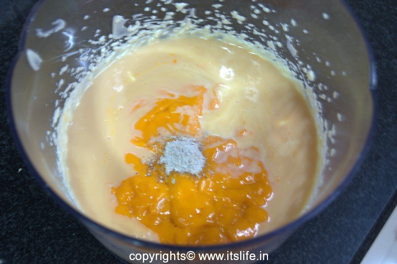 Add Condensed Milk, Cardamom powder, and Mango Pulp and beat again until the ingredients are blended well.