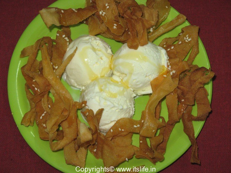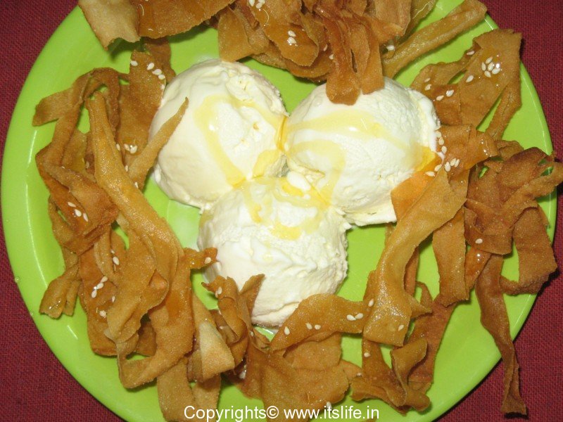 Pour Honey over the fried Wontons. Arrange few scoops of ice cream in the middle of a plate and surround the ice cream with honey wantons.