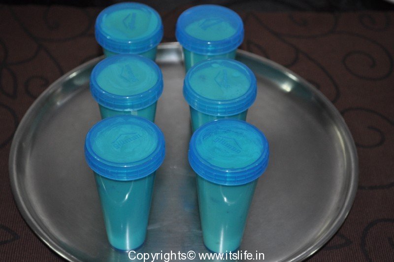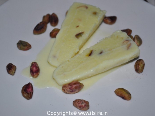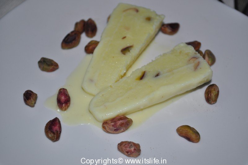 Cool the mixture and pour into Kulfi moulds. Freeze Pista Kulfi for 6 hours.
