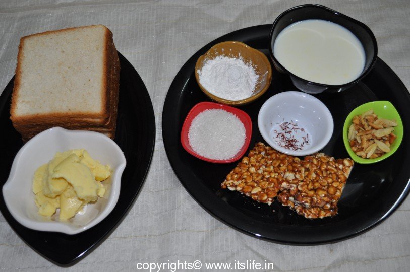 Cut the Bread slices into triangles. Crush the Chikki. Boil Milk with Sugar.