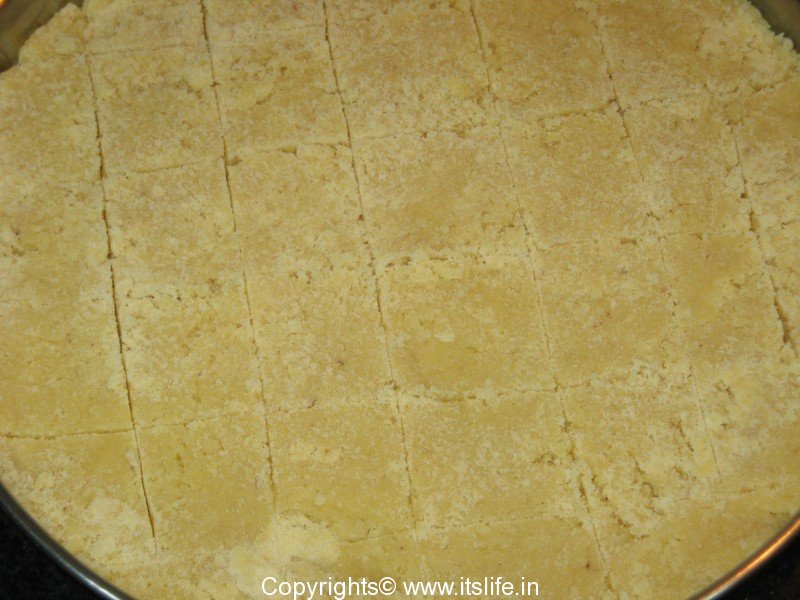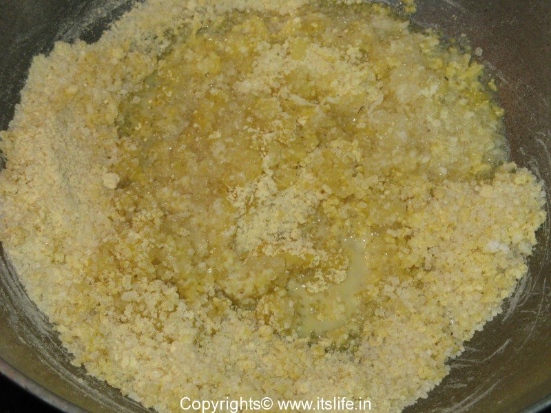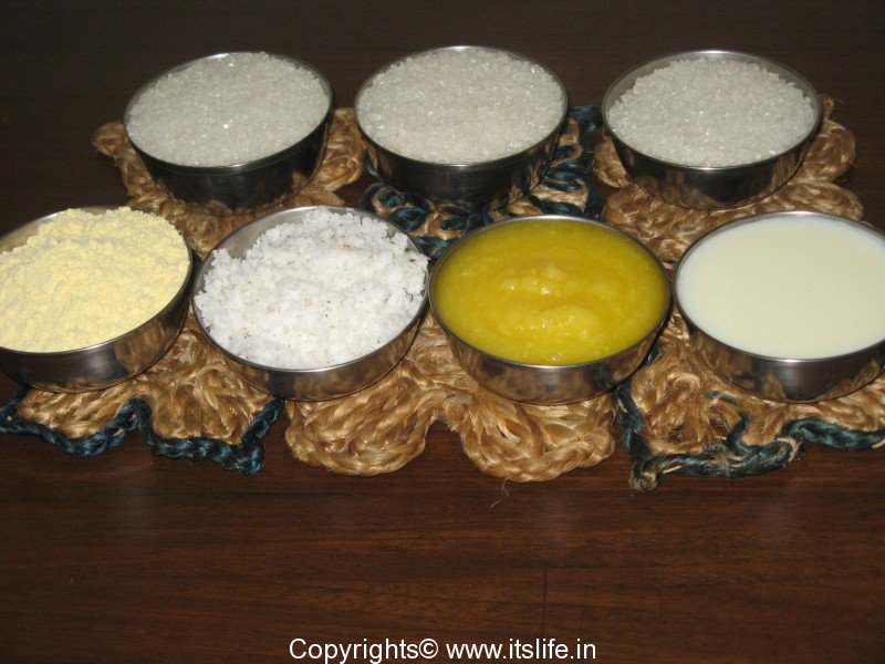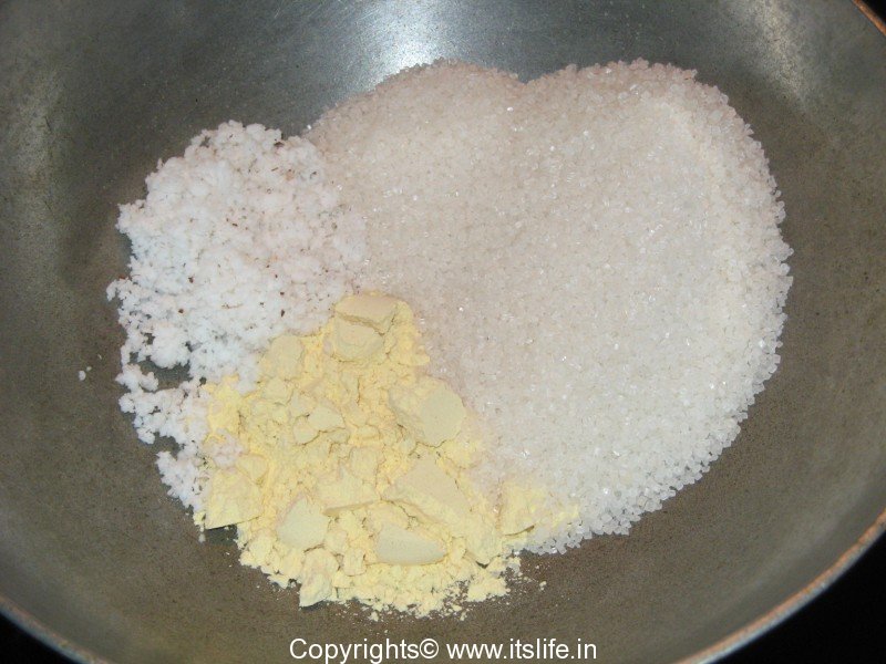 In a thick-bottomed pan, add Gram Flour, Coconut, and Sugar.