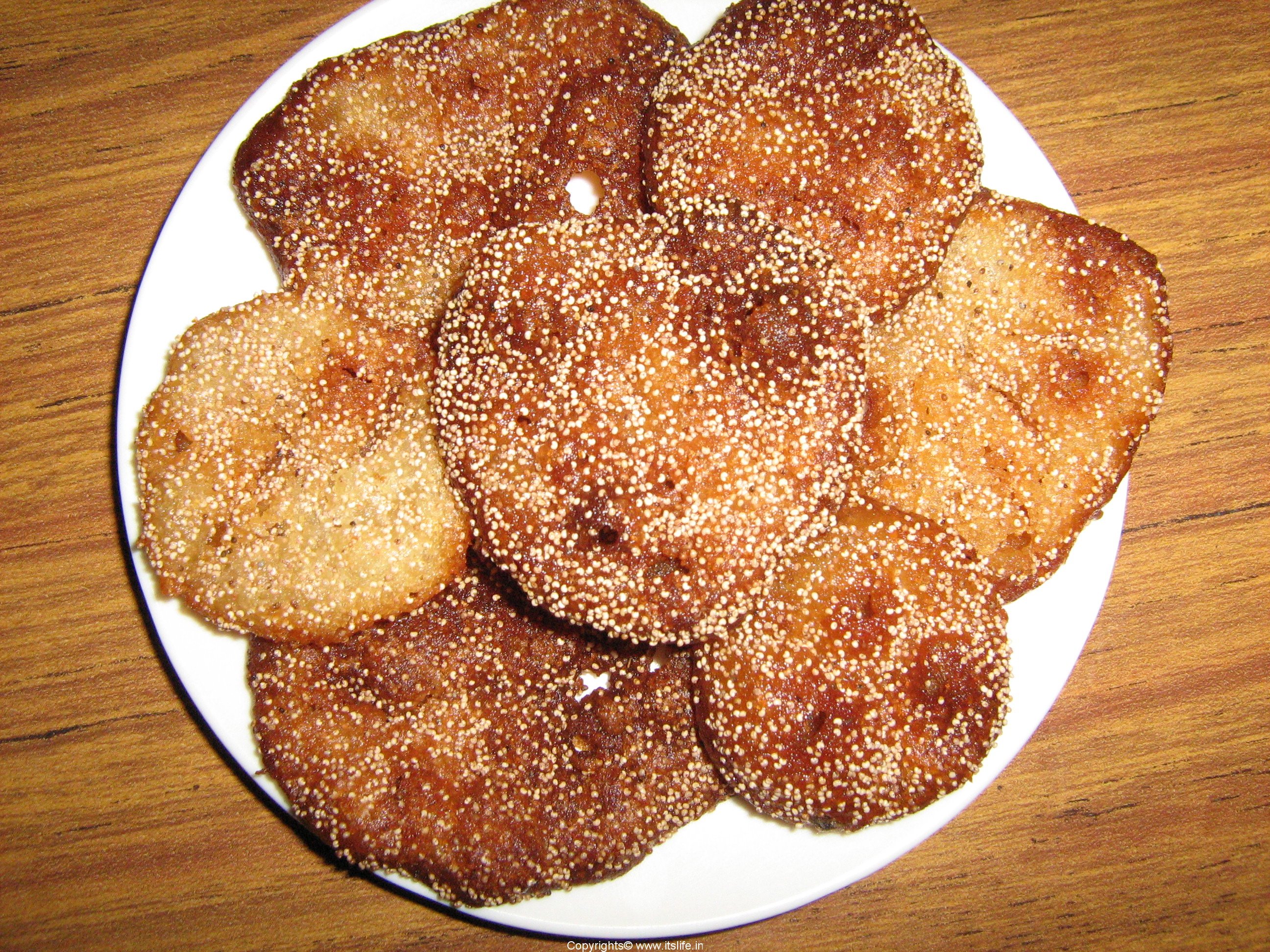 Mix flour and Jaggery and mix well. Leave it aside for 24 hours to ferment. On the fourth day divide the dough into balls. Flatten each ball into a disc and press one side on Poppy seeds and deep-fry until they turn brown.