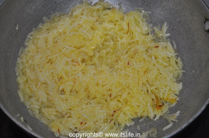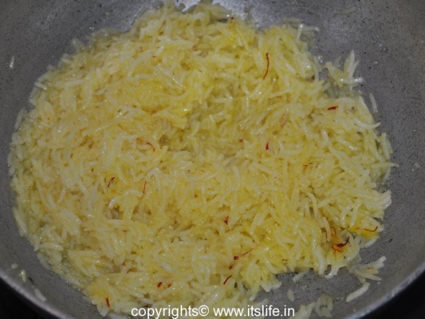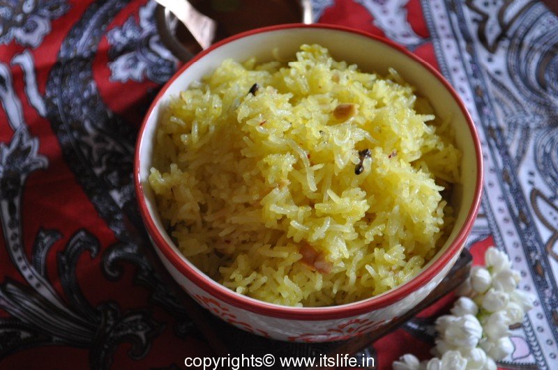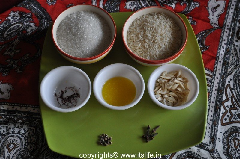Heat Ghee in a handi/vessel, add Cloves, Cinnamon, Almonds and Raisins. Fry for half a minute. Add Rice and 2 1/2 cups of water. Bring it to a boil. Add Saffron and cook on low heat till the Rice is almost cooked. Sieve Sugar syrup into the Rice. Mix gently. Continue to cook on a low heat till the Rice is done and the syrup is dry.