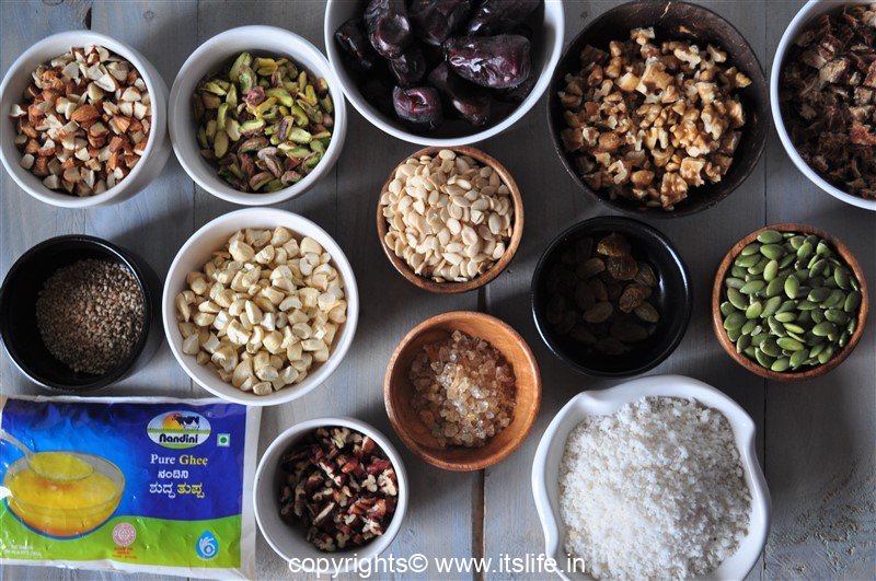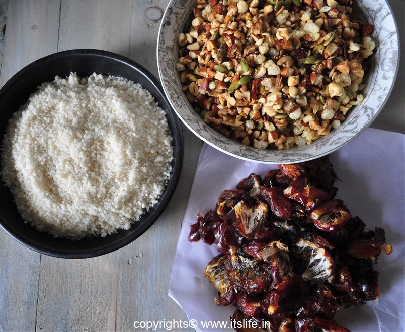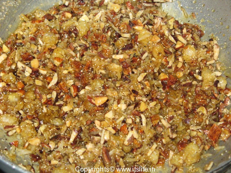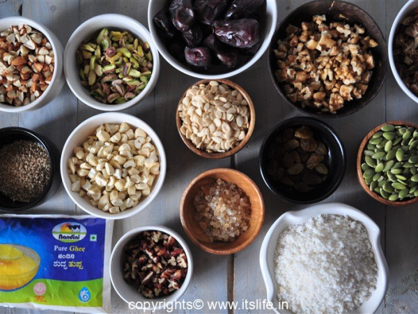 Fry dry fruits, Gum, Dates, Khuskhus, seeds, and Coconut in little Ghee separately and keep them aside.
