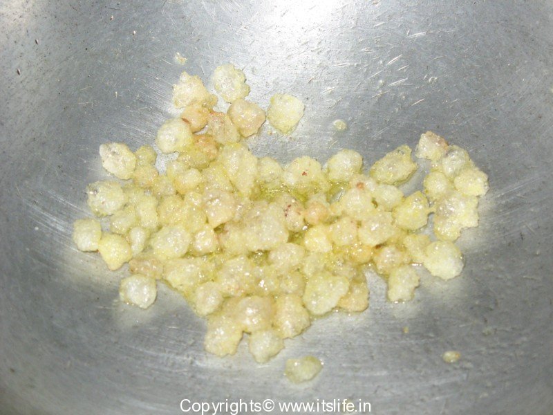If using Jaggery, heat Ghee in a thick-bottomed pan and add Jaggery and 1 Cup water and let the jaggery melt. Keep stirring and cook for 2 minutes until it turns into a syrup.
