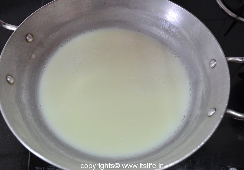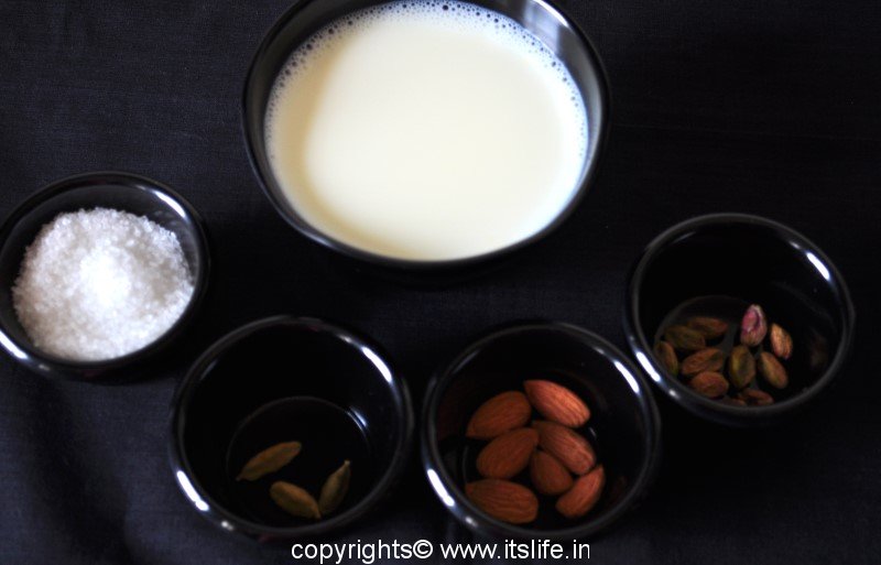 Boil Milk and Sugar until it is reduced to half. Add Nuts, Saffron Milk and Cardamom Powder and mix well. Remove and keep aside.