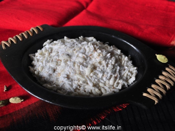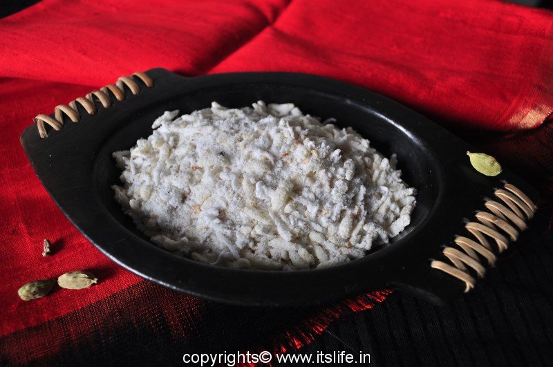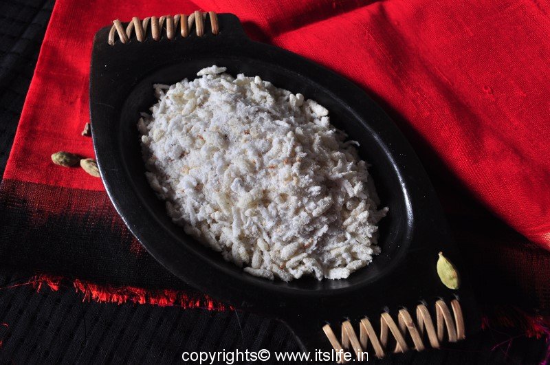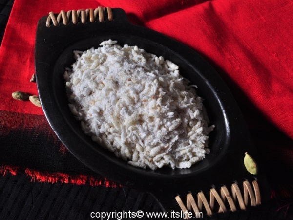 Avalakki Panch Kajjaya is a sweet powdery dish is prepared as prasada / blessed food in temples and at home during festivals. Panch means five and five ingredients go into preparing this dish.