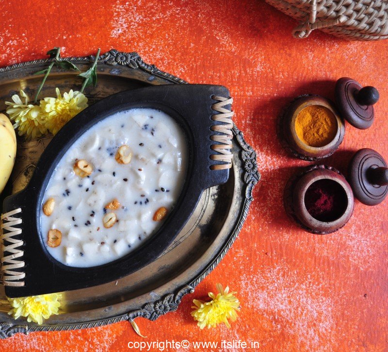 Peel and chop the Bananas. Heat Ghee in a pan and add the Sesame seeds and when they splutter remove to a mixing bow. Add Bananas, Coconut milk, Jaggery, Cardamom Powder to the mixing bowl and mix well. Add the Cashew nuts.
