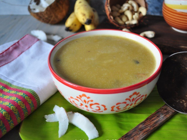 Balehannina Payasa / Banana Payasa is a pudding prepared using ripe bananas, jaggery, and coconut milk.