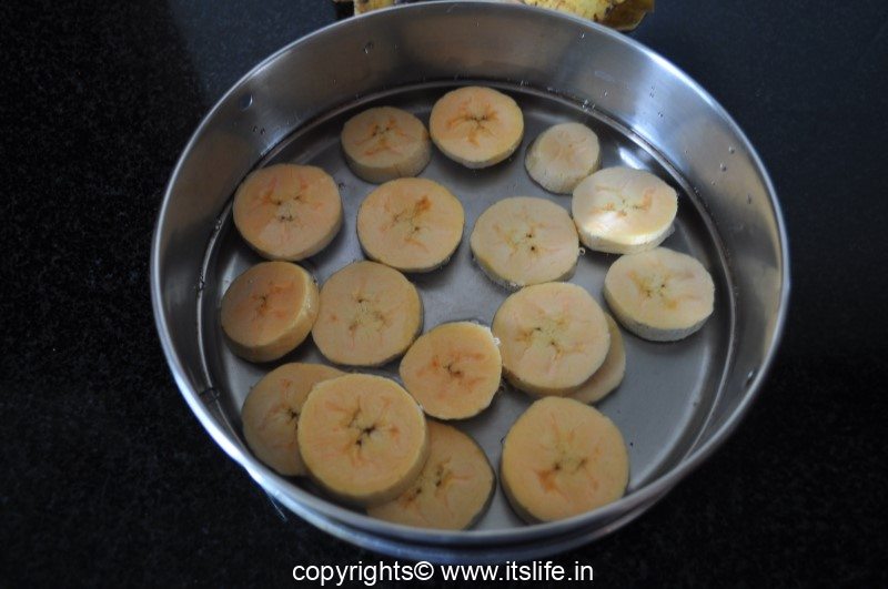 Peel Banana and make roundels. Cook using little water until soft. Mash them.