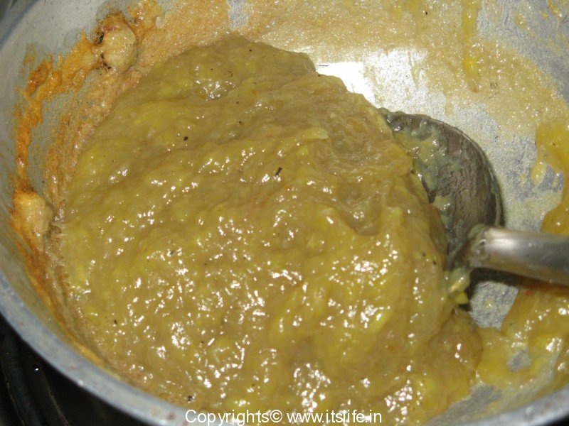 Peel the Bananas and mash the Bananas until they are soft. Heat ghee in a thick-bottomed pan. Add mashed Bananas and cook over low heat, stirring continuously. Cook for 5 minutes.
