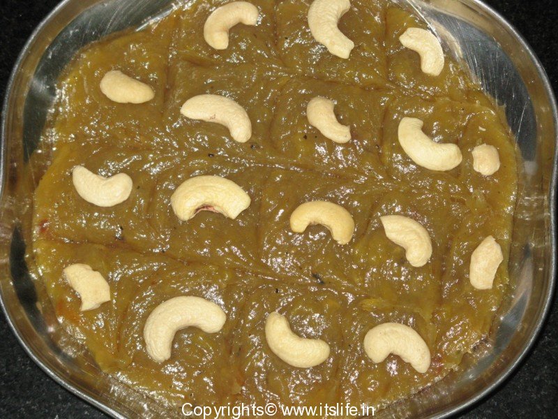 Remove to a bowl or you can spread on a plate and allow it cool and cut into squares. Decorate with Cashew Nuts.