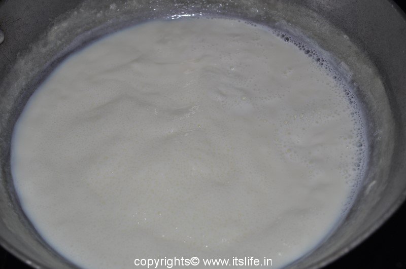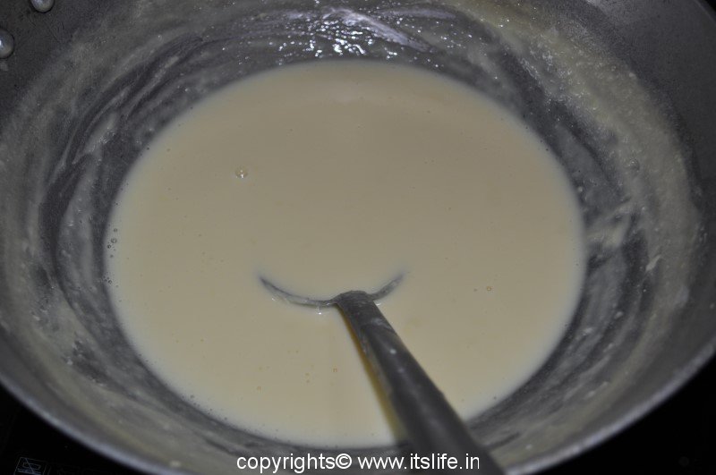 Let the milk reduce. Add Sugar, Saffron and mix well.