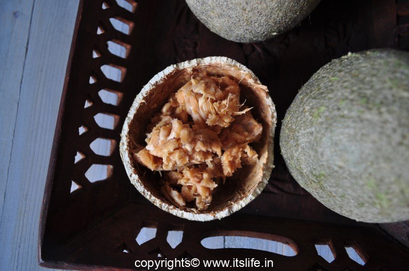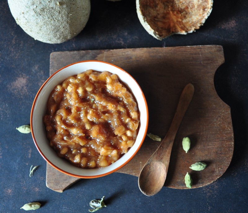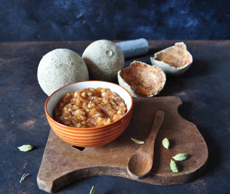 Open the wood apple and remove the ripe rind into a mixing bowl. Add Jaggery and Cardamom powder and mix well. Chill and serve.