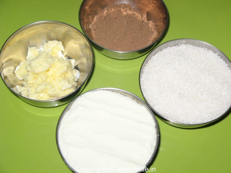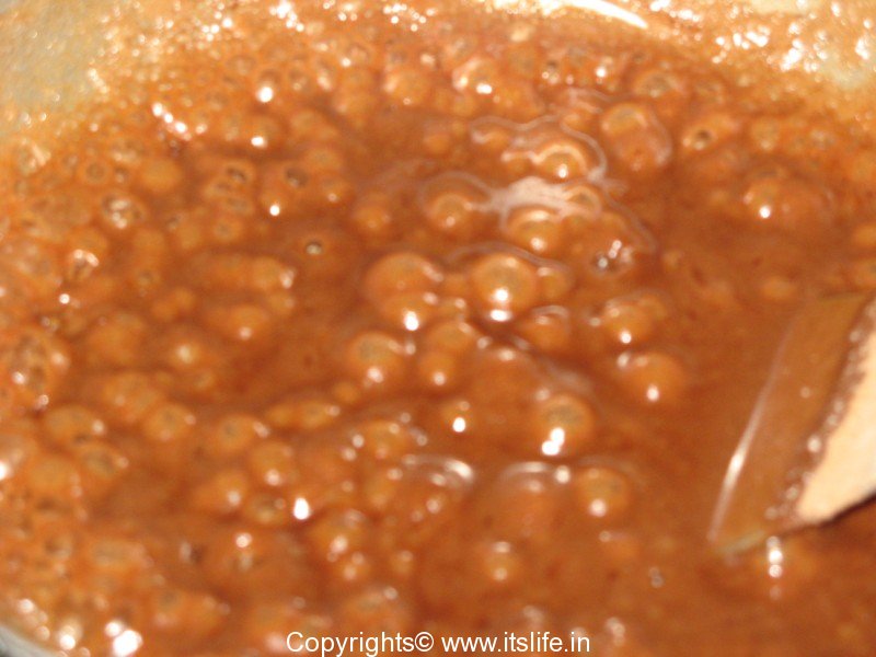 In a thick bottomed pan add sugar and ¾ cup water. Let the sugar melt, next add butter and cocoa powder and let it come to a boil.
