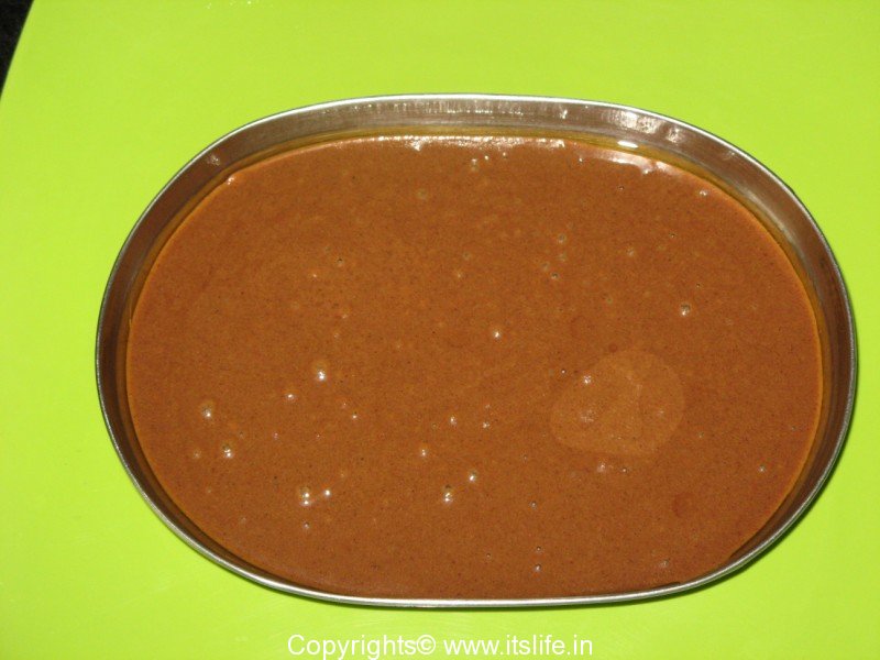 The mixture become semi solid and when it starts leaving the sides, the mixture stuck to the sides quickly solidifies. This is an indication that the mixture has to be poured out on the tray.