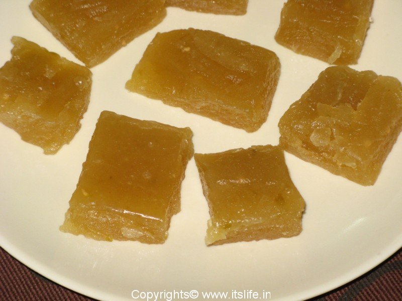 Grease a plate with butter and spread the mixture on the plate. Let it cool. Cut into desired shapes and wrap each piece in butter paper and store in clean dry containers.