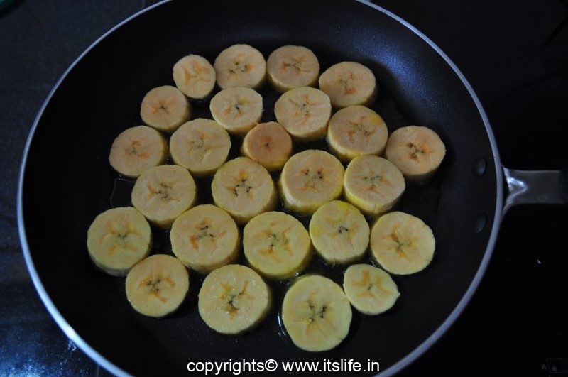 Peel Bananas and cut into roundels or any desired shape. Melt Ghee in a non stick pan. Add the Banana roundels and saute’ for 20 seconds.
