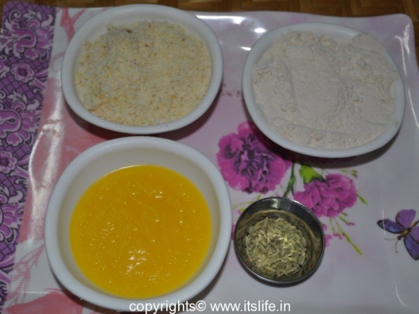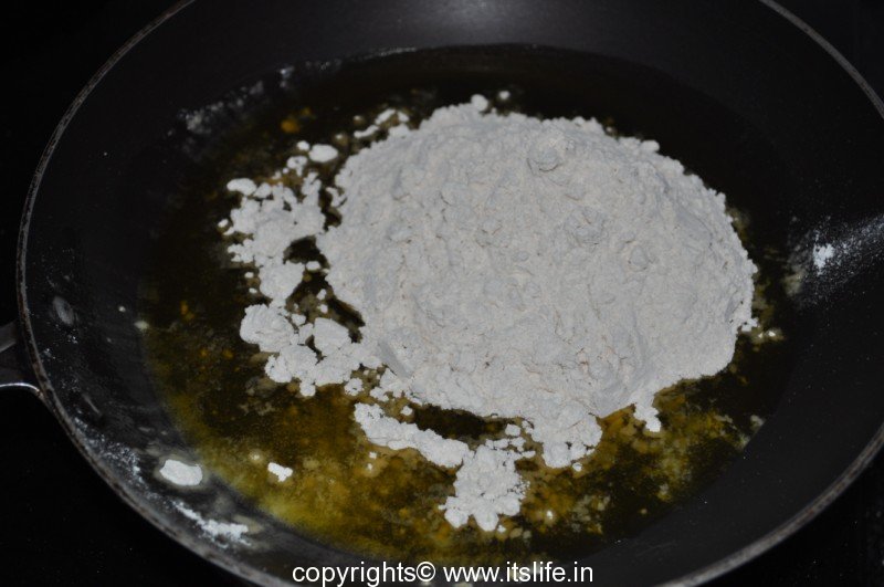 Fry Wheat flour in Ghee until an aroma arises.