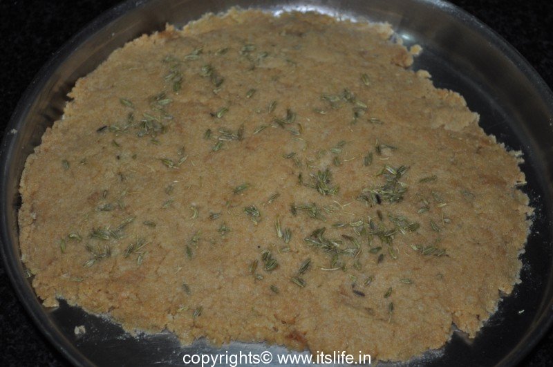 Sprinkle saunf on the surface and press them down.