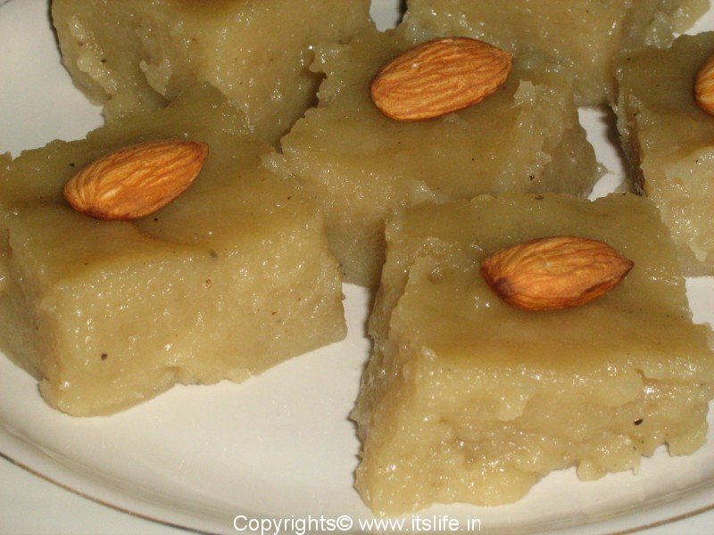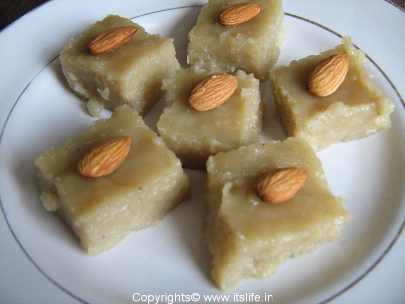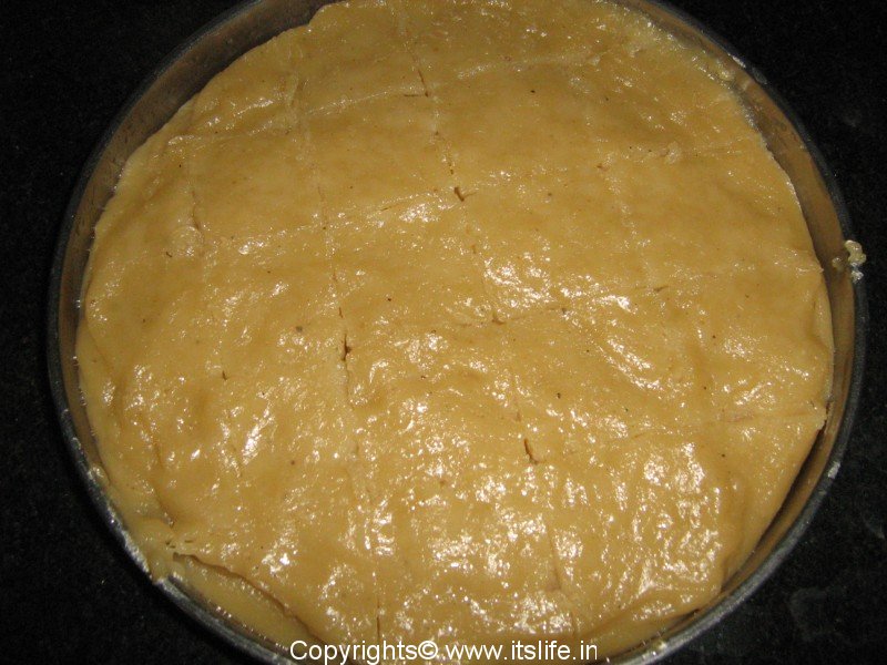 Grease a plate with Ghee and spread the mixture evenly in the plate. Add more Ghee if needed to smoothen the top. Let it cool. Cut into desired shapes and decorate each piece with an Almond and serve. It can be stored upto 5 days in the refrigerator.