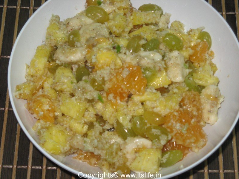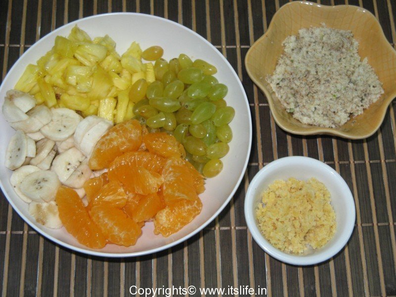 Grind coconut, mustard seeds, and chilies to a paste. In a mixing bowl mix the fruits with jaggery, salt, and the coconut sauce.