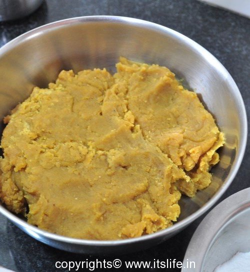 Soak Bengal Gram for 2 hours. Cook Bengal Gram and Tuvar Dal. Sieve and keep aside. Reserve the water for preparing Kattina Saru (Curry). Add the Dal and Jaggery in a Kadai/Pan and let it cook. Keep stirring until the water evaporates. Remove from heat and let it cool. Grind this to a paste. Add Khuskhus, Coconut, and Cardamom to the hurana (dal paste) and mix well.