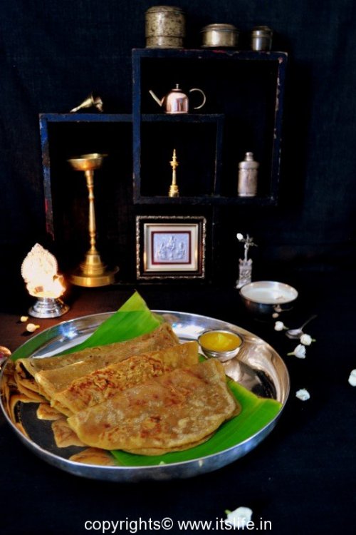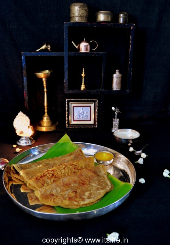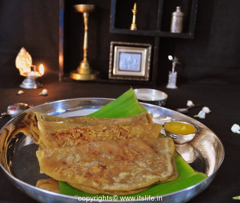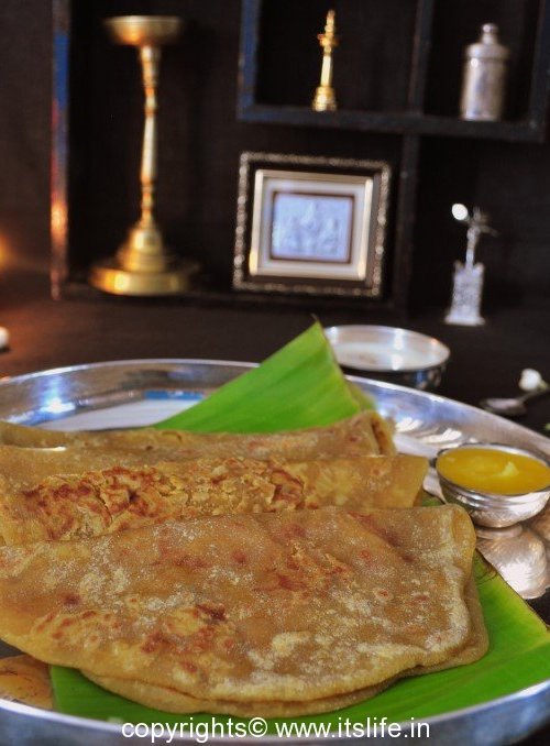 A sweet flat bread, stuffed with a mixture of Jaggery and cooked lentil. This is also known as Obbattu and Puran Poli and is prepared on festivals.