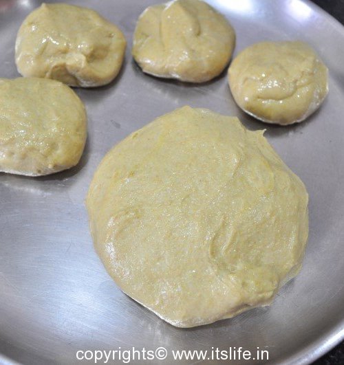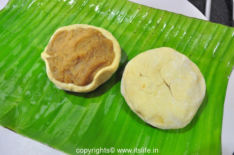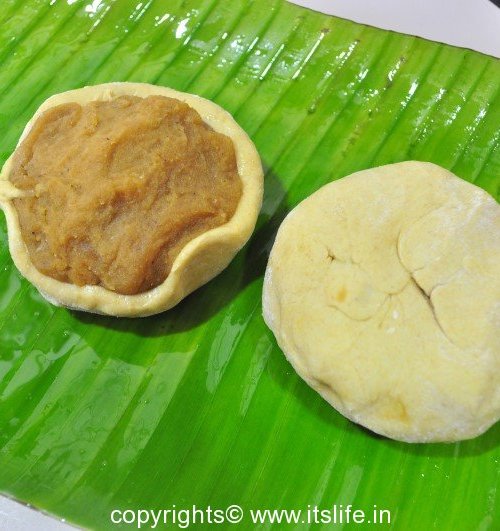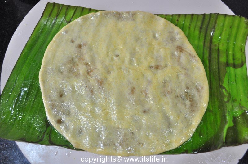 Now on a greased plantain leaf flatten this stuffed ball into a circle.