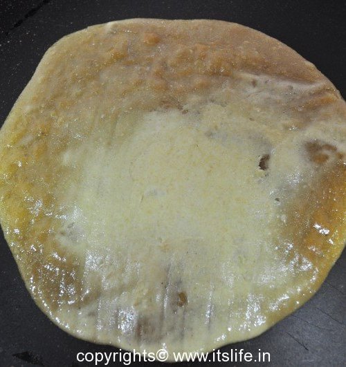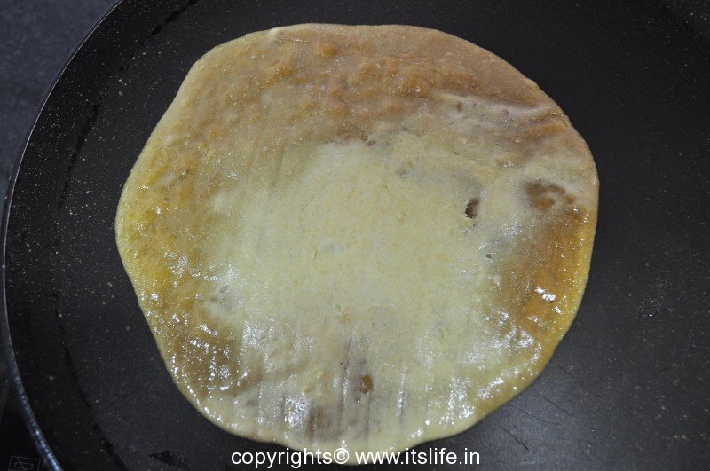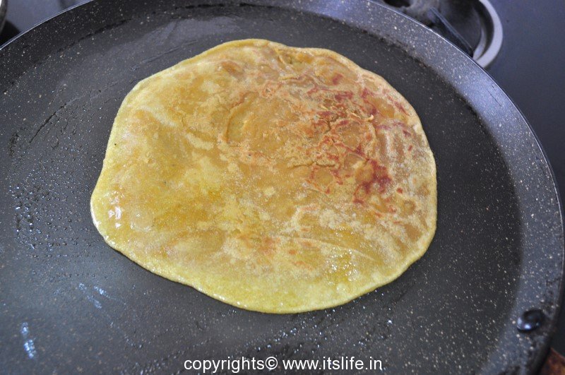 Heat a griddle and grease it. Take the plantain leaf along with the holige (bread) and flop it on the tava with the holige facing down.