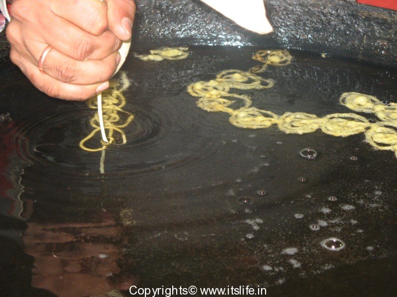 Heat Oil in a flat Kadai/Jalebi kadai and pour the Jalebi batter through a Coconut shell with one hole or through a cloth bag with a small hole in a circular shape with lines running all over to form a maze or a mesh. Fry till crisp (do not let them turn brown) and remove them and dip them in the Sugar syrup for sometime. Remove them when they are steeped in Sugar syrup. Garnish with Pistachios and Saffron.