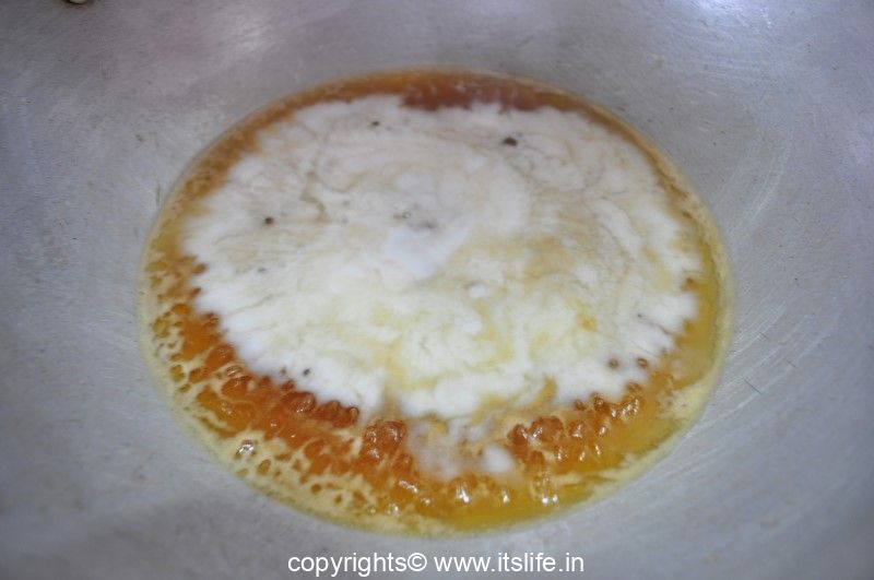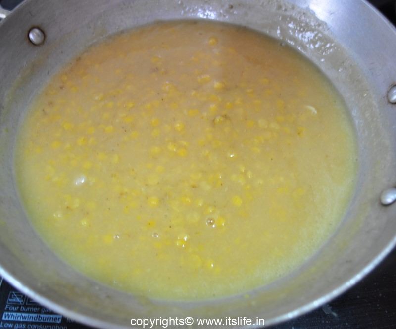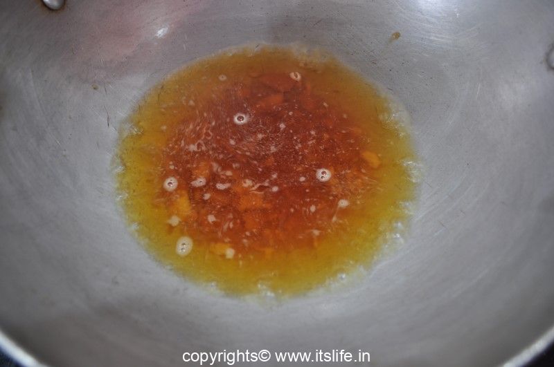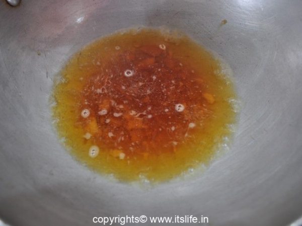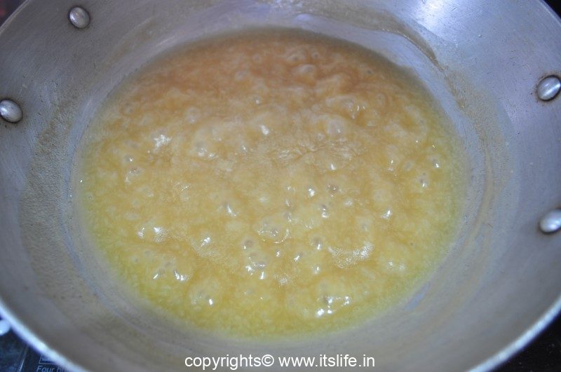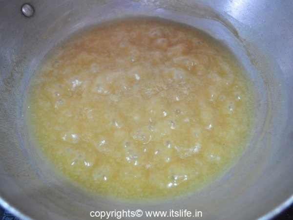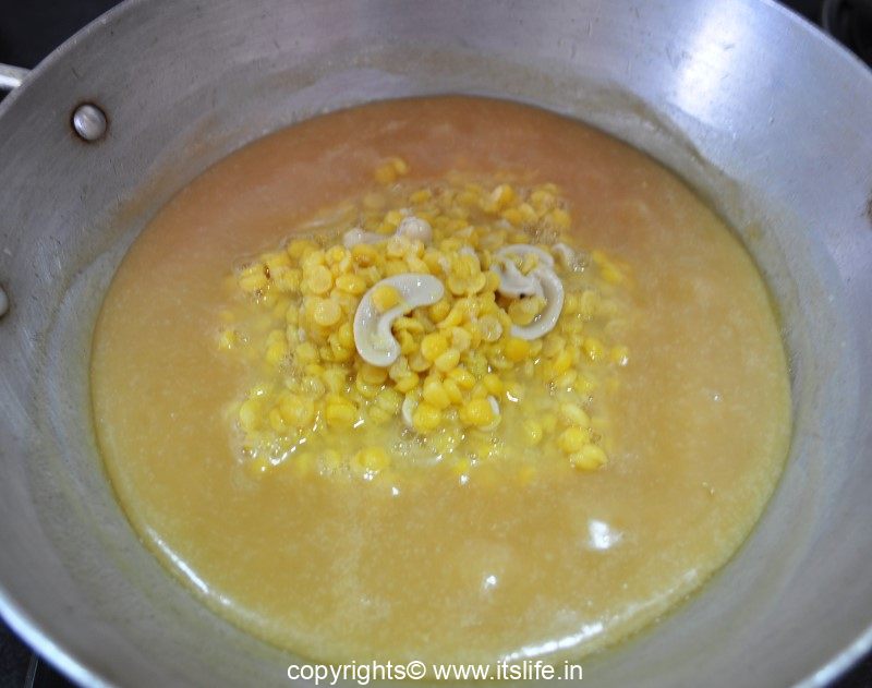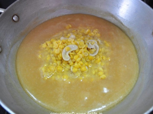 Cook Kadalebele and Cashew nuts with 2 cups of water in cooker sieve and leave it aside. In a thick-bottomed pan add Jaggery and add one cup of water. After the jaggery melts, sieve the Jaggery mixture and again pour into the pan.