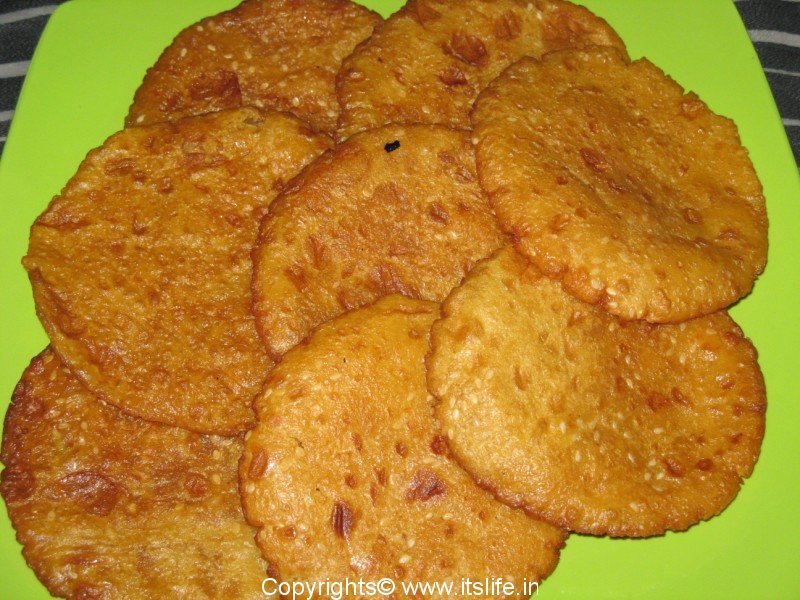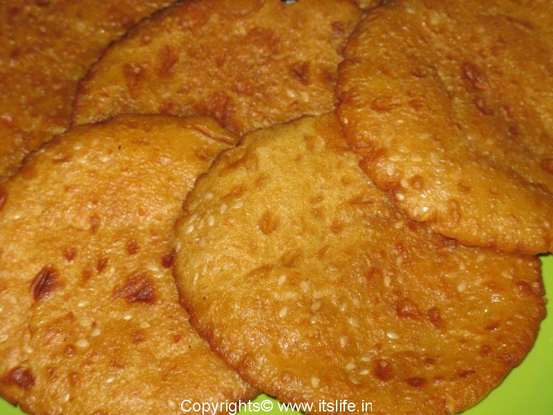 Add water to Jaggery and make syrup. To check the consistency of the syrup, drop some syrup into some water. It should sink down and settle at the bottom in the form of a ball. Remove the syrup from heat and add the rice powder, Gasagage and Maida, stirring continuously. Ensure that no lumps are formed. When the mixture is cool knead the mixture. The consistency of the dough should be similar to that of Chapathi dough. Divide into small balls and press each ball on the palms and deep fry till brown.