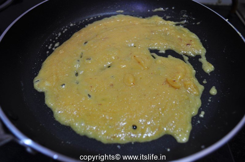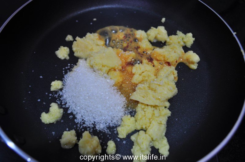 Crumble the Khoya. Add Khoya to a thick-bottomed pan. Add Sugar and the Saffron Milk.