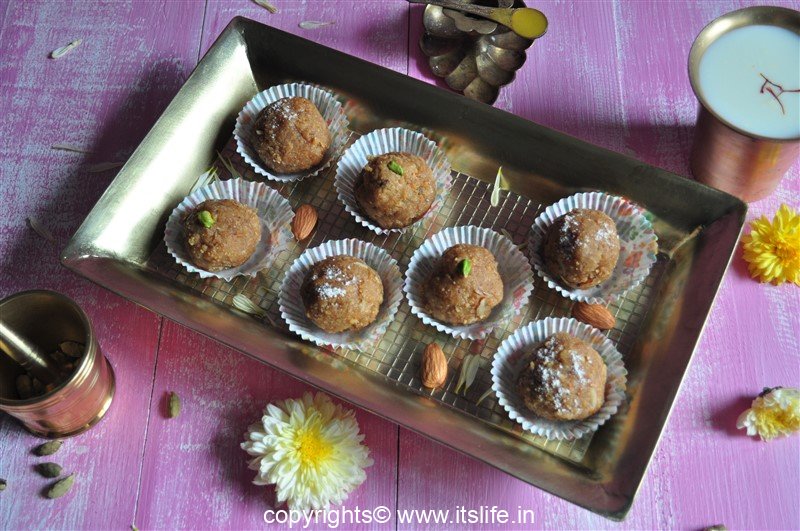 Garnish with your choice of dry fruits or nuts. Serve Maledi or Churma Laddoo with Milk and Ghee.