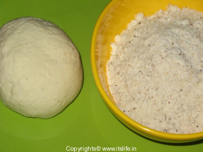 Mix the ingredients for the filling in a bowl and keep it aside. Mix the ingredients for the outer layer with water and knead to a dough. Cover the dough and keep it aside for an hour.