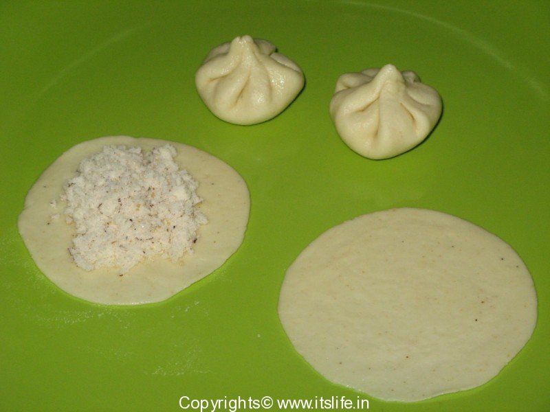 Divide the dough into marble sized balls. Roll out each one into concentric circle. Put a spoonful of the coconut mixture and shape into a modaka.