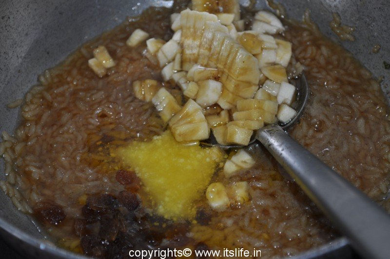 Cook Rice and keep it aside. In a thick bottomed pan, add Jaggery and one cup water. Cook on medium flame until the Jaggery melts. Add cooked rice and mix well.