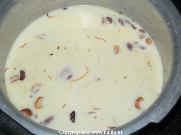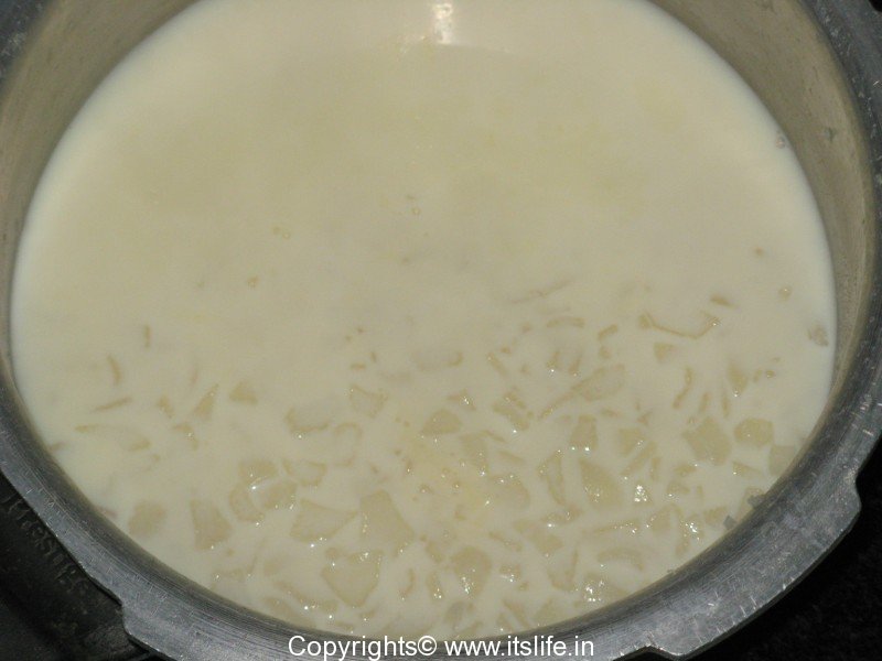 Take Ada in a cooker, add Milk and half cup water. Pressure cook for one whistle.