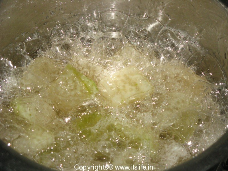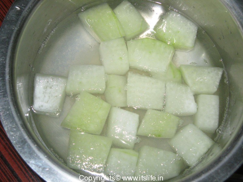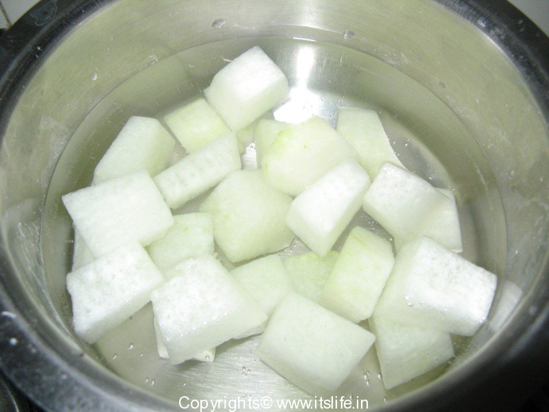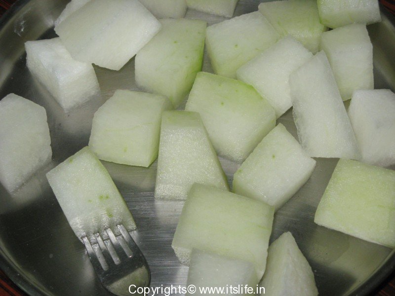 Peel and cut Ash gourd into big cubes. Prick the cubes of Petha with a fork.