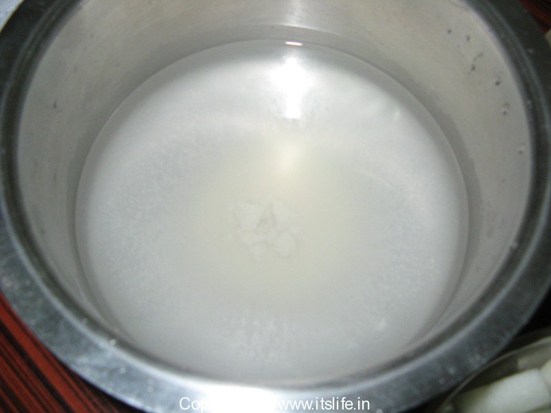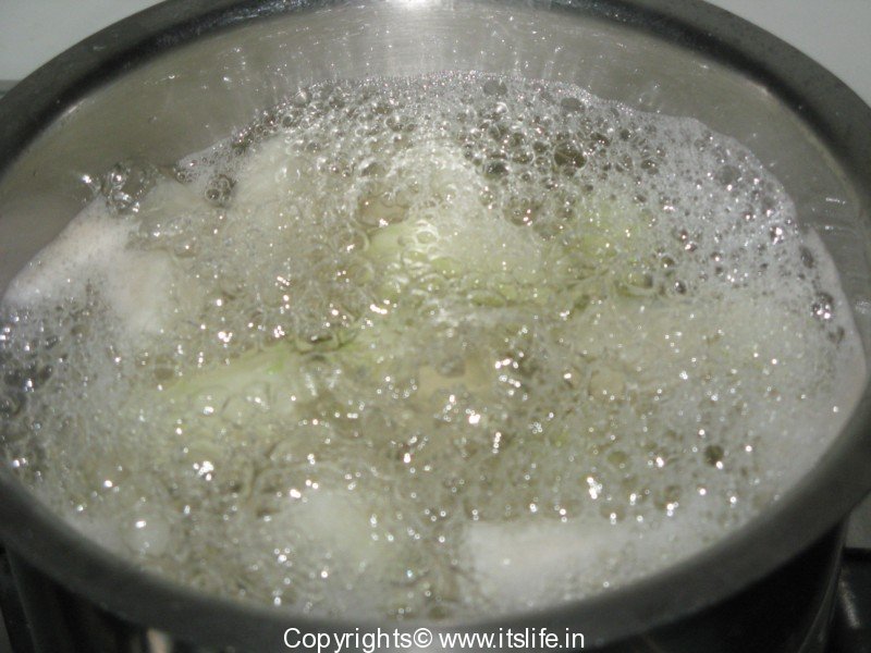 Add 4 Cups water to the Sugar and prepare a thick syrup. Add Petha pieces to the boiling syrup and continue to heat until you get a double thread consistency.