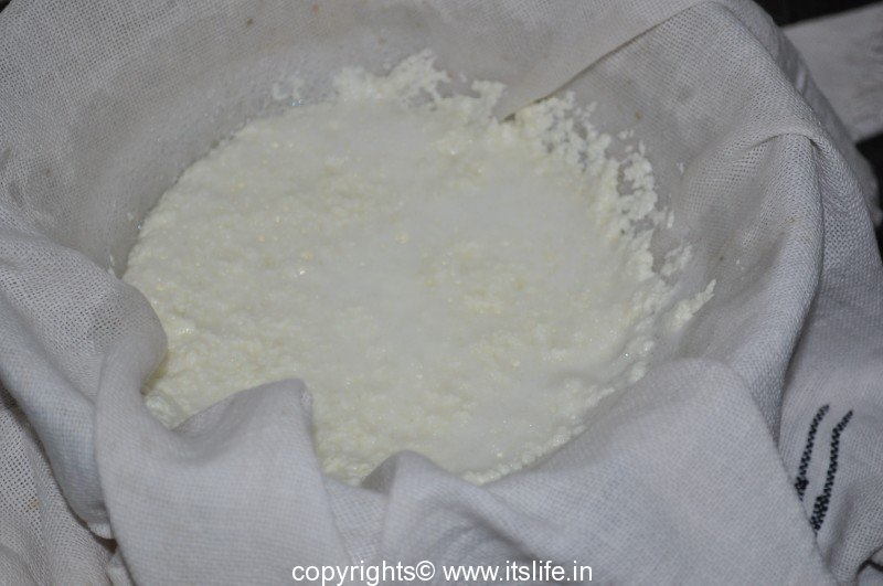 Boil Milk and add Lemon juice to curdle it. Sieve in a cloth and leave it aside for few minutes. Remove the Chenna / Cheese from the cloth.
