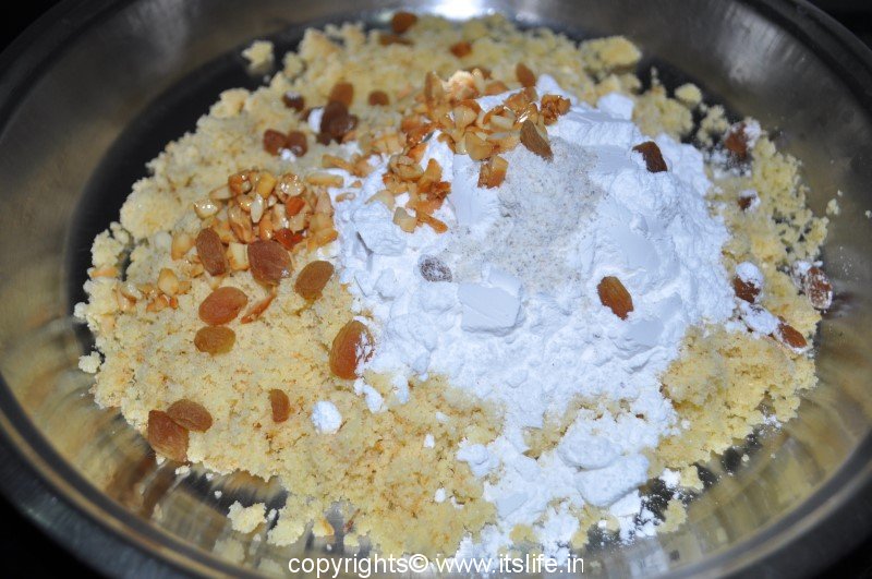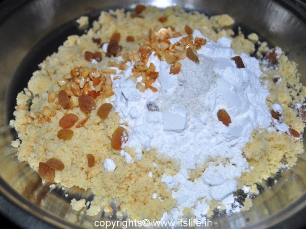 Remove from fire and mix Sugar, Elaichi/Cardamom and nuts and mix well.