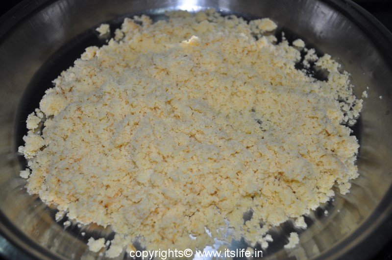 Mix Rawa and Coconut. Heat Ghee in a kadai and add Rawa and fry until an aroma arises.