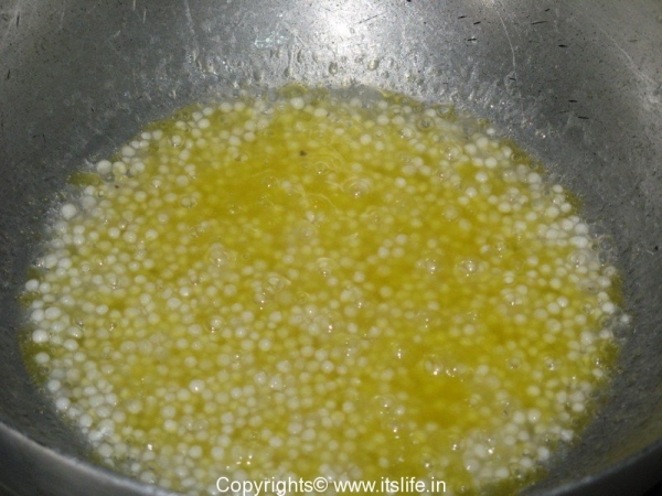 Heat Ghee and add Sabudana. Fry until Sabudana starts to pop.